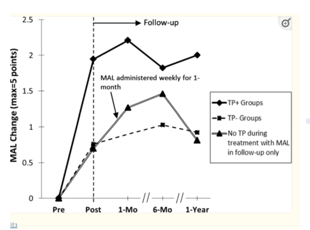この論文では、TP(使う手にするための戦略)をした群(TP+)としなかった群(TP-)で、麻痺手の使用頻度(MAL)に違いがあるのかを検証しています。
