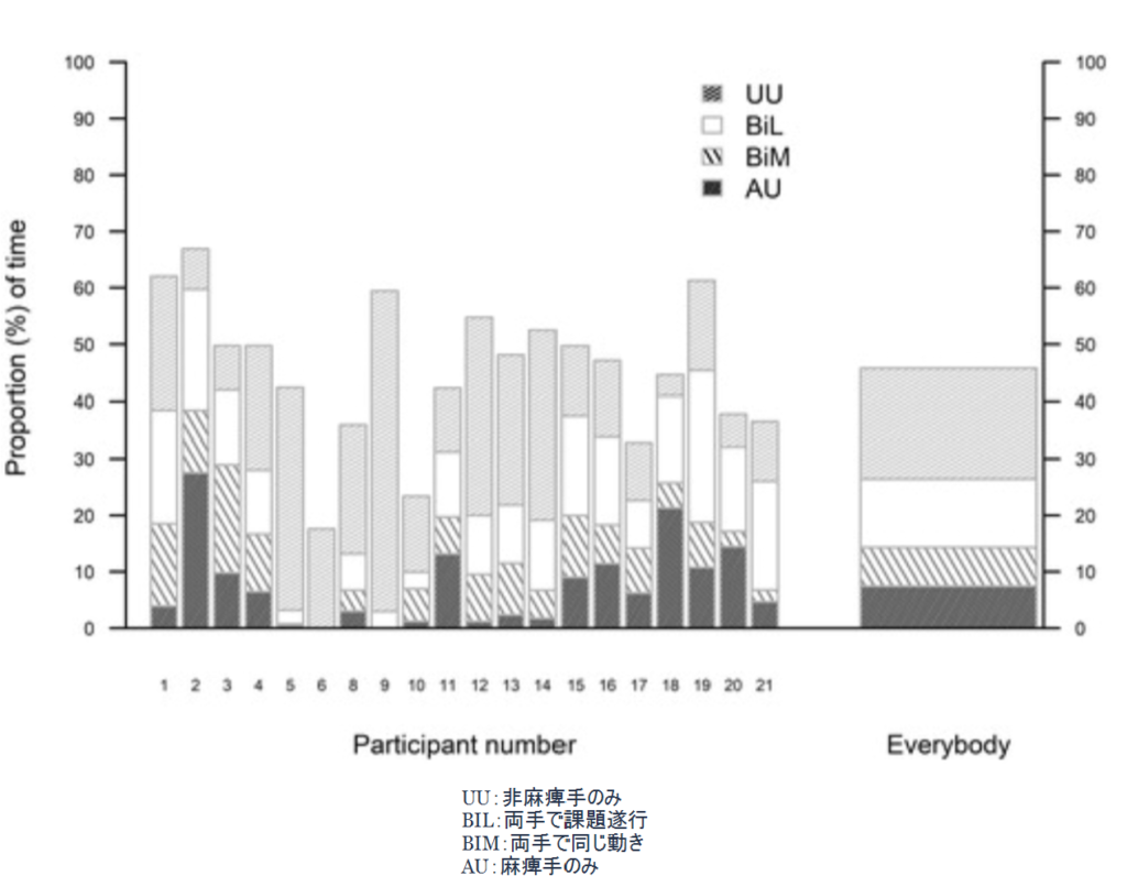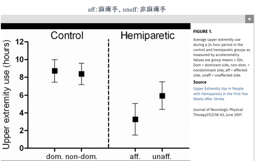 この研究の残念な点は、対象者の麻痺の程度が不明ということ。また、先ほどの研究よりも調査時間が半分となっています。そのため、単純な比較はできません。ですが、麻痺手の使用時間は10年前よりも少し上がっているとも解釈できます。