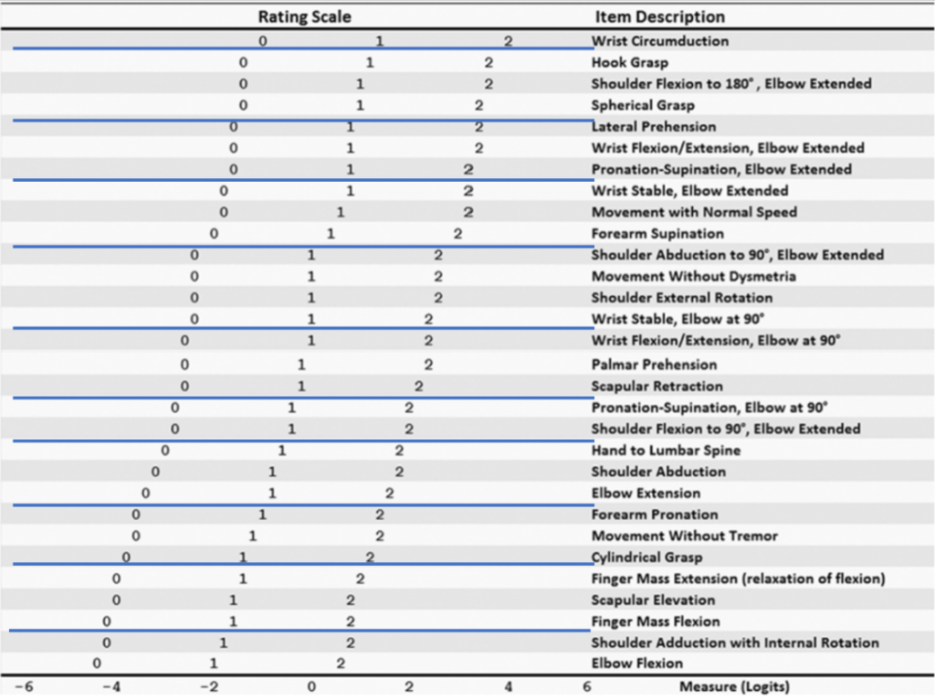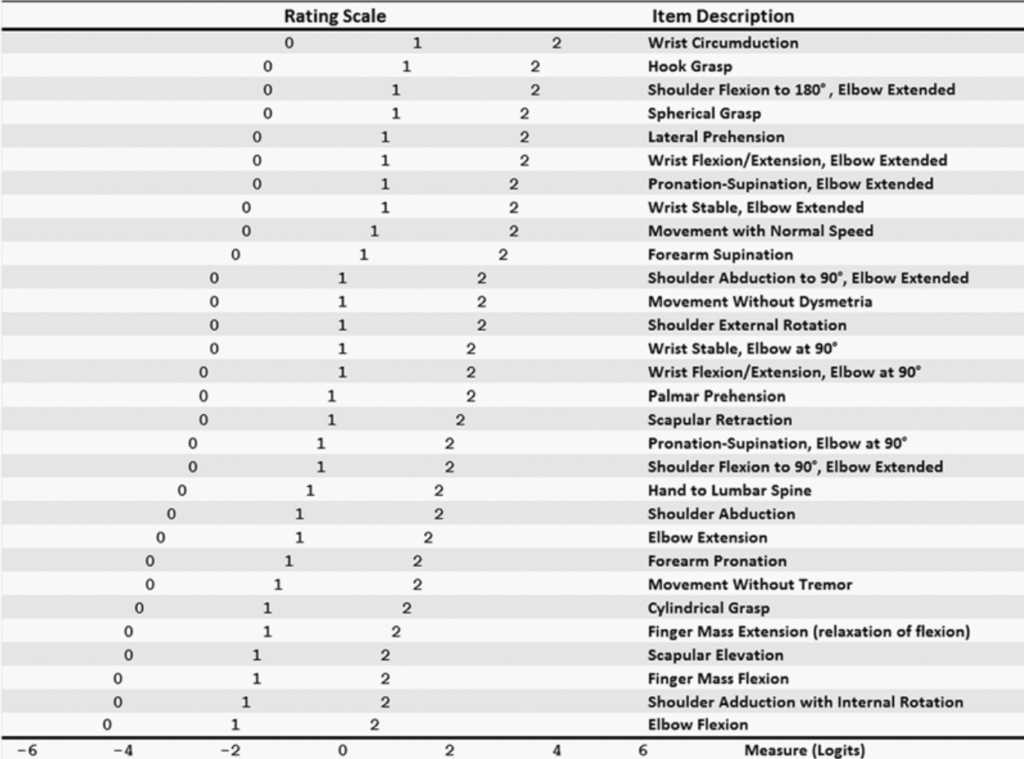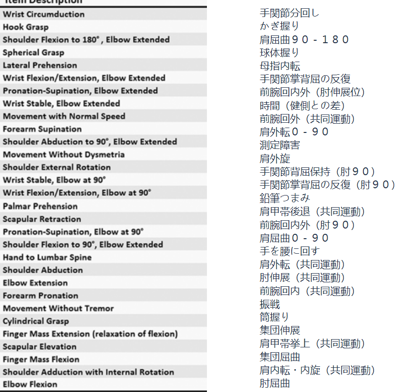 下に行くほど難易度が低くなっています。もっとも難易度が低いのが「肘の屈曲」でもっとも難しいのが「手関節回し」です。日本語に訳したものを載せておきます。