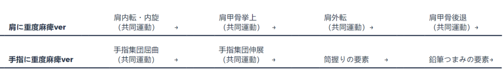 最重症レベルの麻痺があった場合、もっとも低い階層の運動を促通していくことを治療方針とします。そのため、まずは「肩内転・内旋と手指の集団屈曲」となるでしょう。